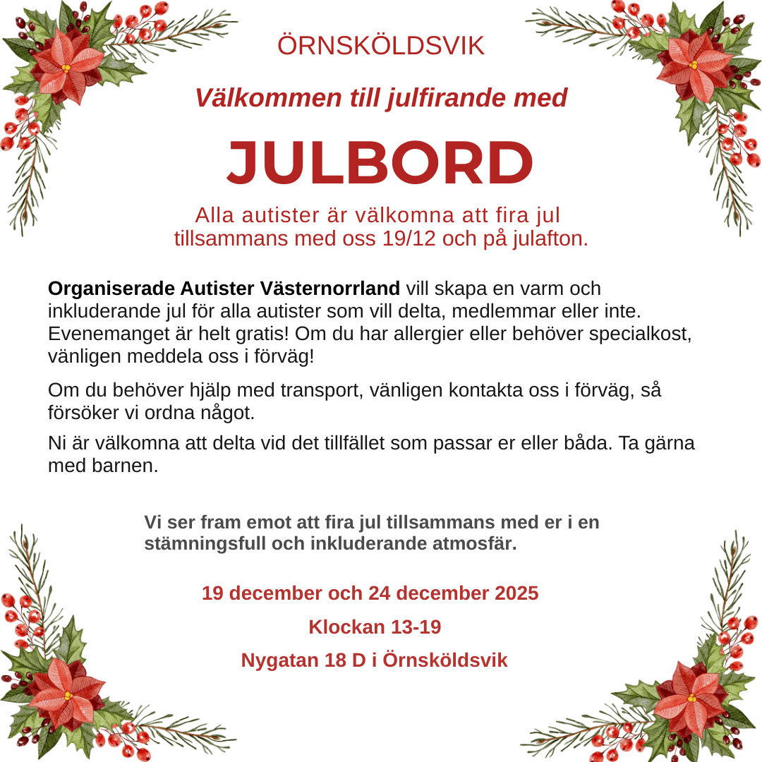 Vi är glada att bjuda in er till vårt traditionella julfirande med julbord vid två tillfällen, fredagen den 19 december och på julafton. Syftet med detta evenemang är att skapa en varm och inkluderande plats för autister. Det är således öppet för alla autister, oavsett medlemmar eller inte.